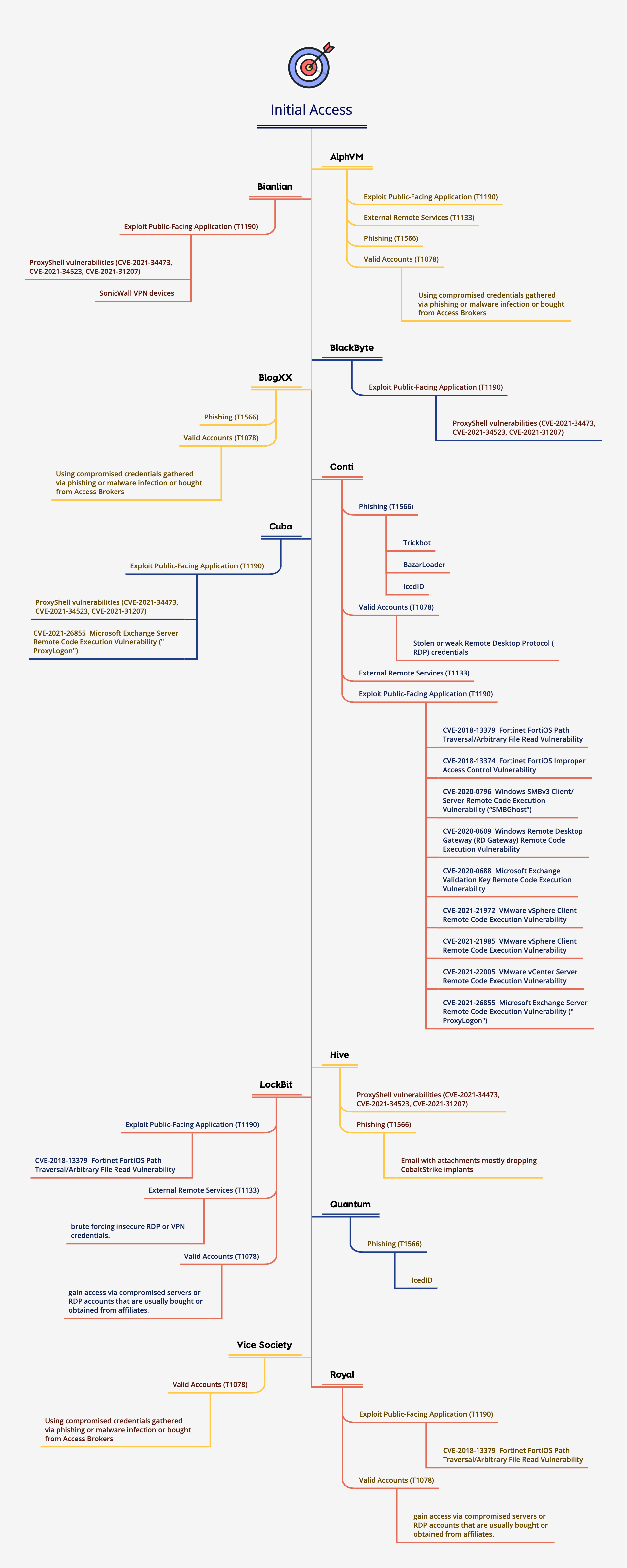 The following mindmap shows ransomware operators’ path to gain initial access to organisations.