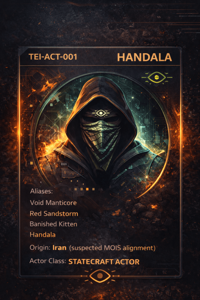 Handala is not simply a hacktivist group shouting into the void. Security research suggests the persona is connected to an Iranian threat cluster known as Void Manticore, also tracked by various researchers under aliases such as Red Sandstorm and Banished Kitten.